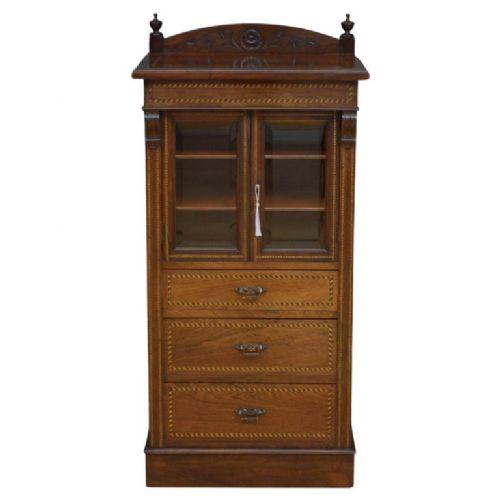Elegant Edwardian rosewood music cabinet with simulated rosewood mahogany sides, having shaped upstand with finials to the back edge and moulded top above a paid of glazed doors with original bevelled edge glass and working lock and a key above three inlaid and graduated drawers fitted with original brass handles, all flanked by fine drop carvings, standing on plinth base. This antique cabinet is in home ready conation.