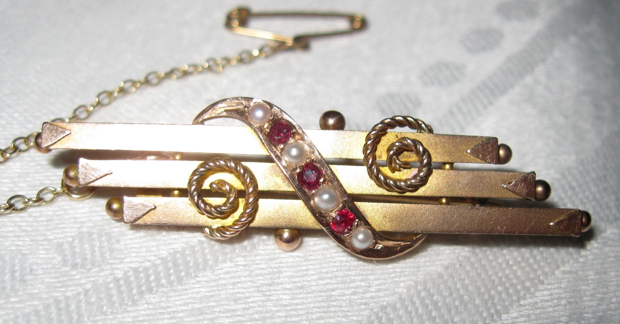 Edwardian Ruby & Seed Pearl 9ct Gold Bar Brooch, Chester 1902