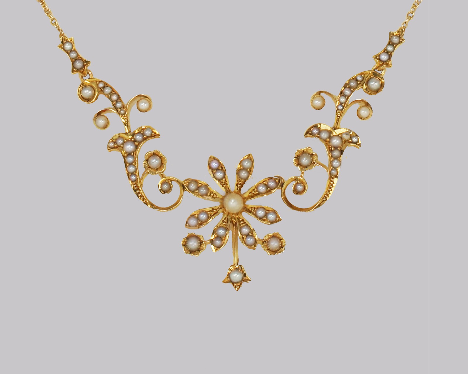 Edwardian Seed Pearl Necklace 9ct Gold Floral & Scroll Antique Necklace C.1910