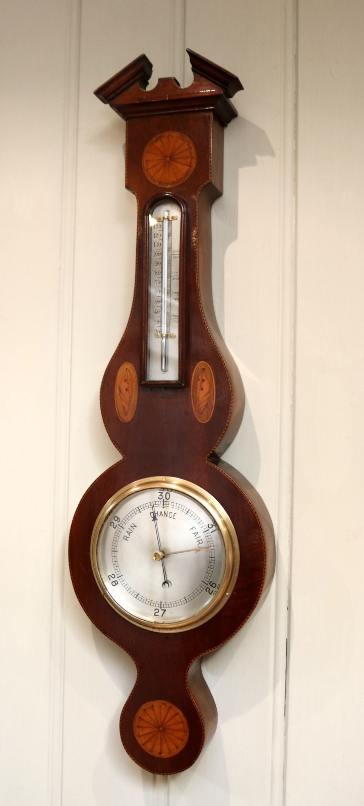 Edwardian Sheraton Style Mahogany & Inlay Aneroid Barometer