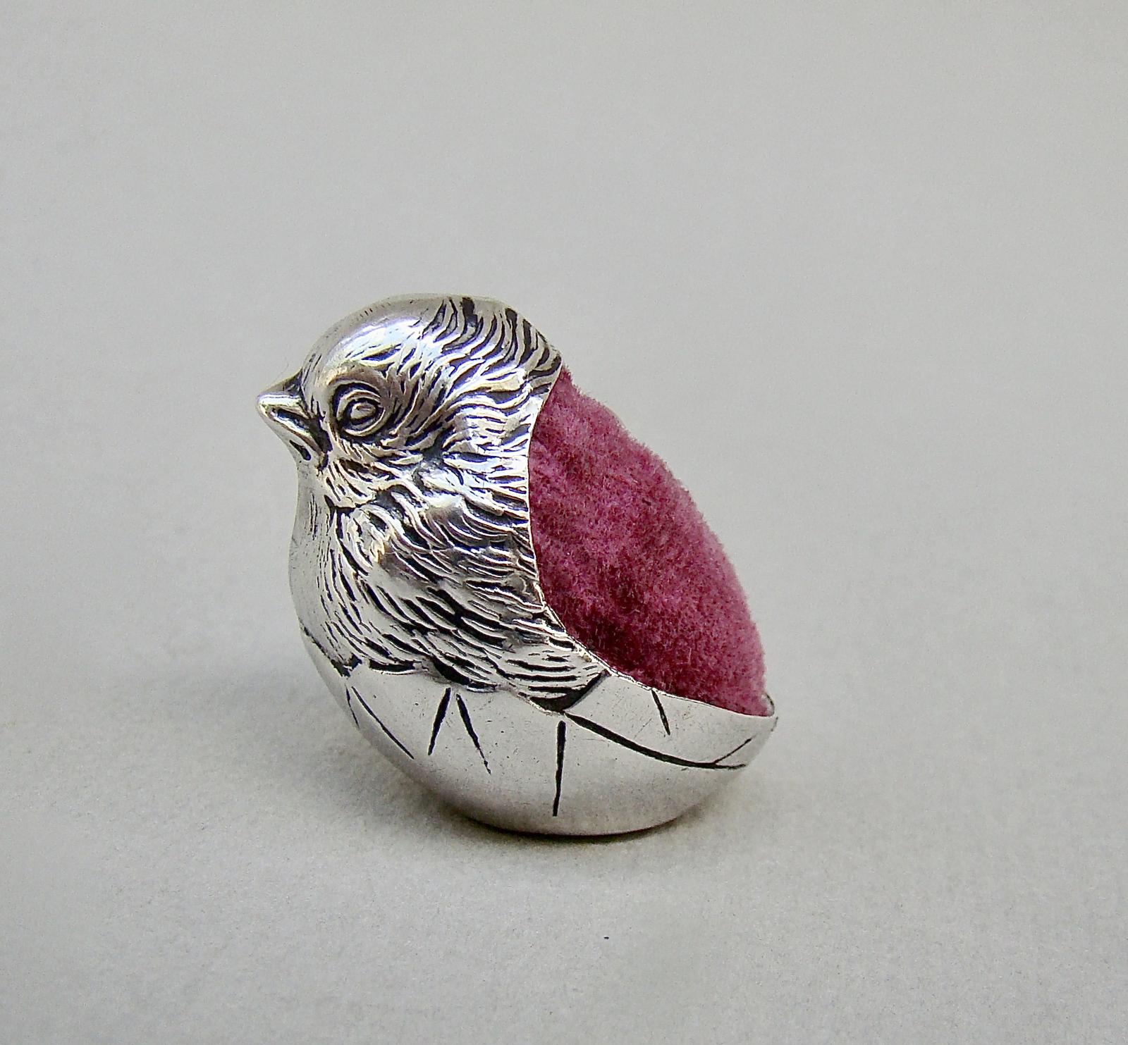 Edwardian Silver "Hatching Chick" Pin Cushion by Sampson Mordan & Co, Chester 1907
