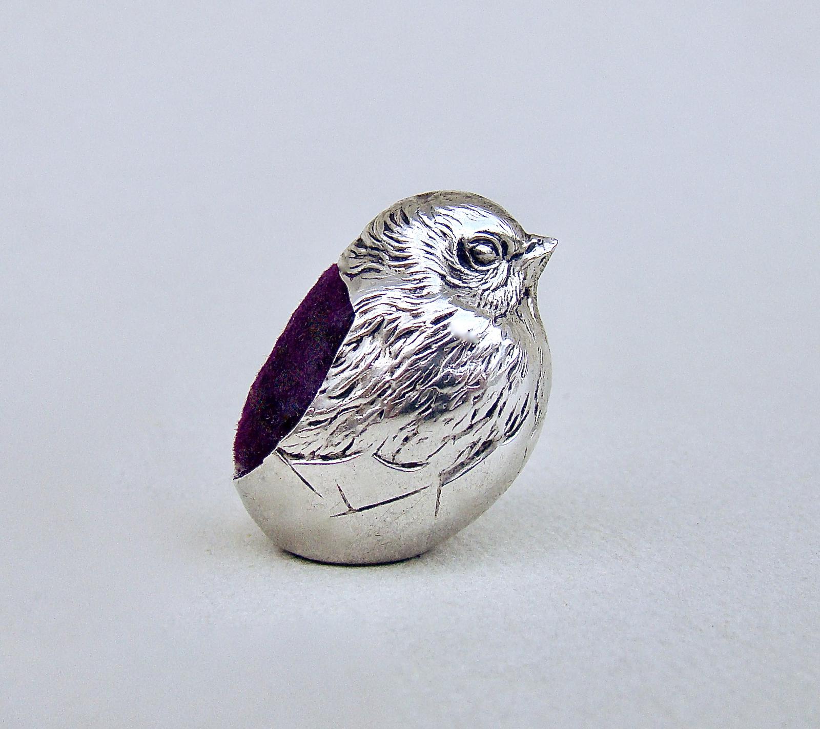 Edwardian silver "hatching chick" pin cushion by Sampson Mordan & Co, Chester 1908