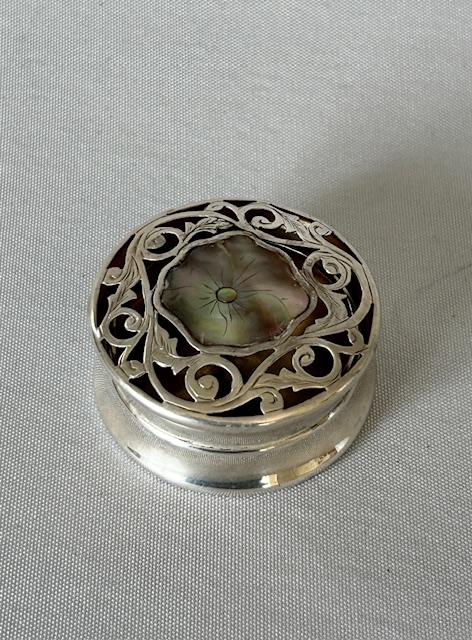 A gorgeous Edwardian flower themed pot-pourri box in the Art Nouveau taste. The body and lid are of hallmarked silver with a 'waisted' body. The fabulous lid is pierced and engraved with foliate motifs. To the centre is a stunning mother-of-pearl insert, representing a pansy. The pull off lid opens to reveal a fully gilded interior.