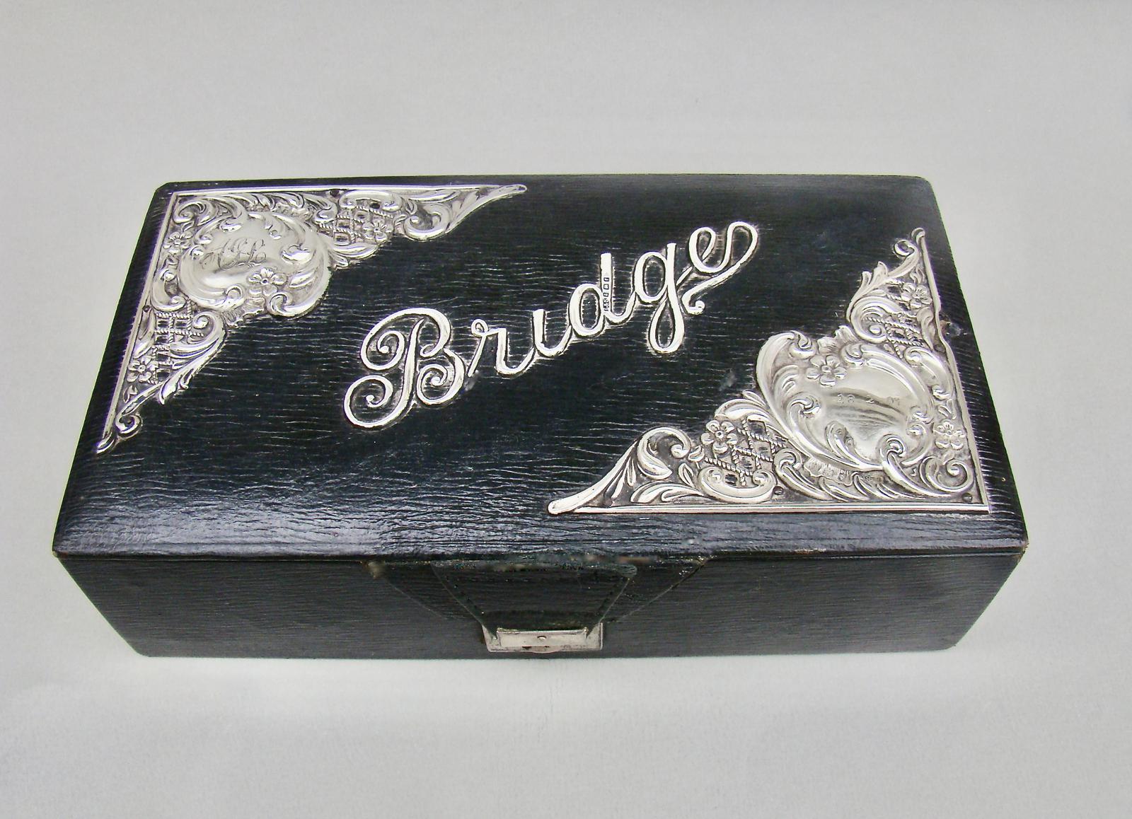 Edwardian Silver Mounted Bridge Playing Cards Leather Box by Levi & Salaman, Birmingham 1905