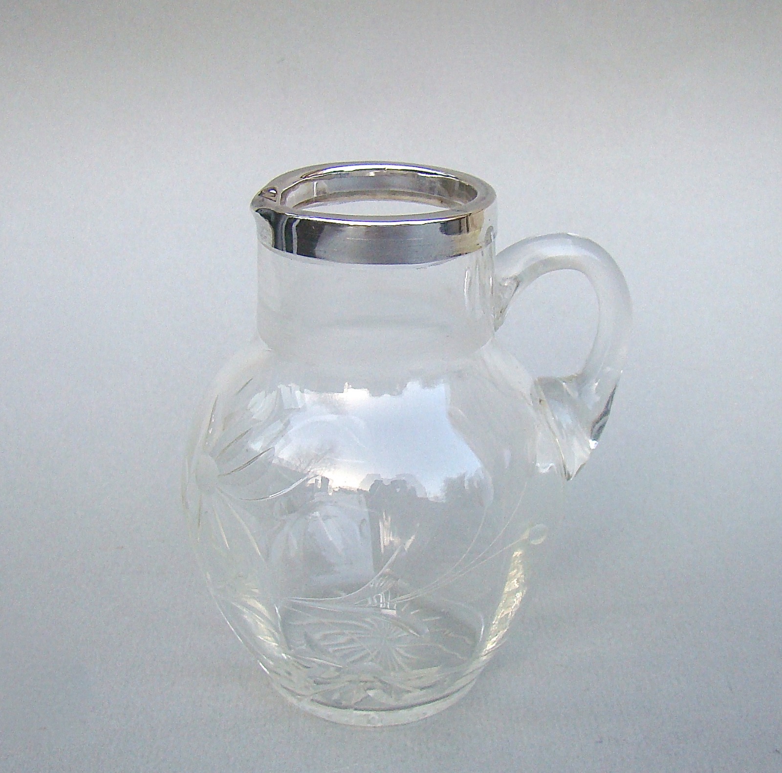 Edwardian Silver Mounted Engraved Glass Cream Jug by Robert Pringle, London 1906