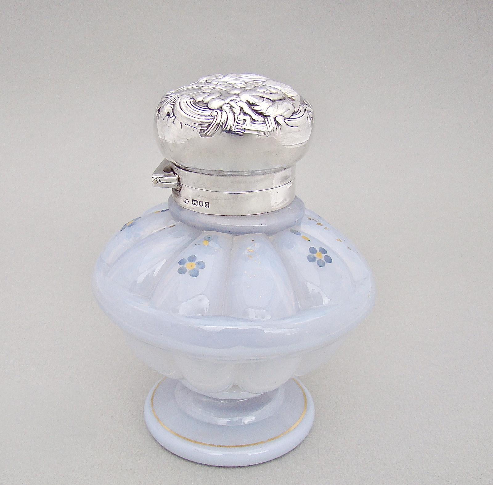 Edwardian Silver Mounted Opaline Glass Scent Bottle / Cologne Bottle by William Comyns, London 1909