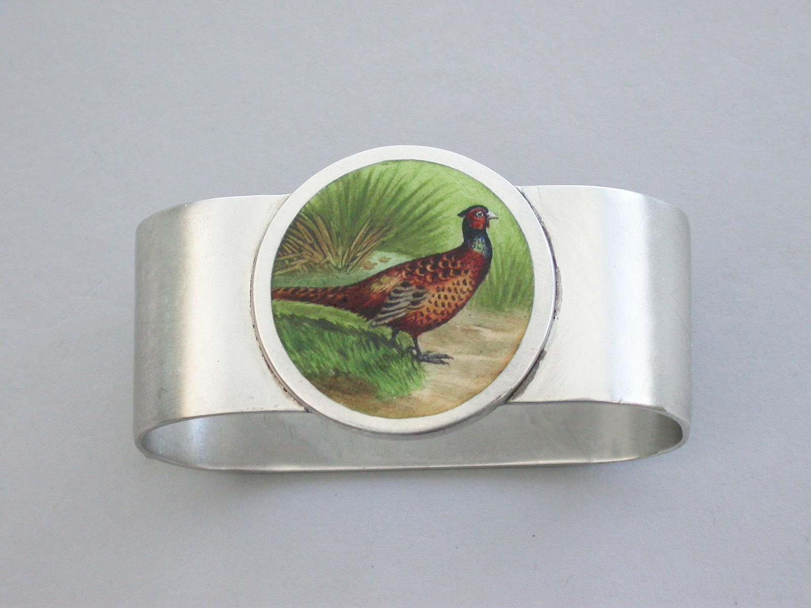 Edwardian Silver Napkin Ring Enameled with a Cock Pheasant