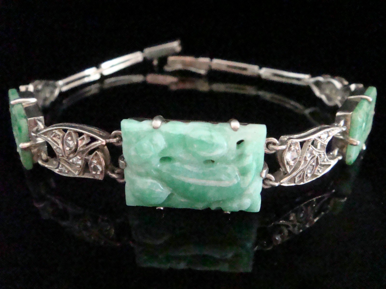 Edwardian Silver Natural Jade & Old Cut Diamond Set Bracelet
