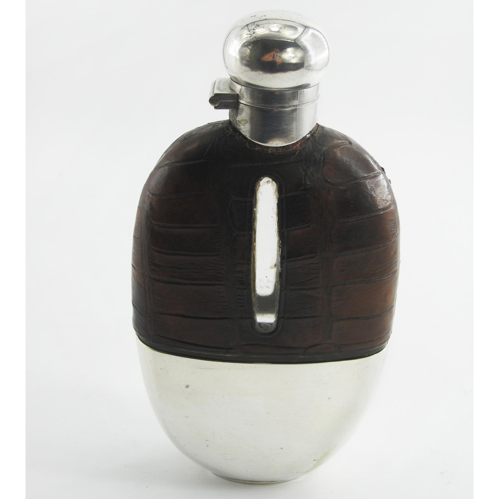 Edwardian Silver Plated Hip Flask with Glass Body & Crocodile Skin