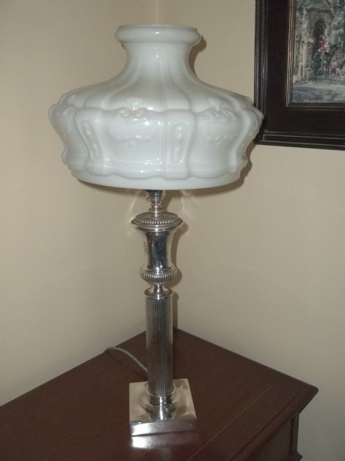 Edwardian Silver Plated Reeded Table Lamp and Large Glass Opaline Shade