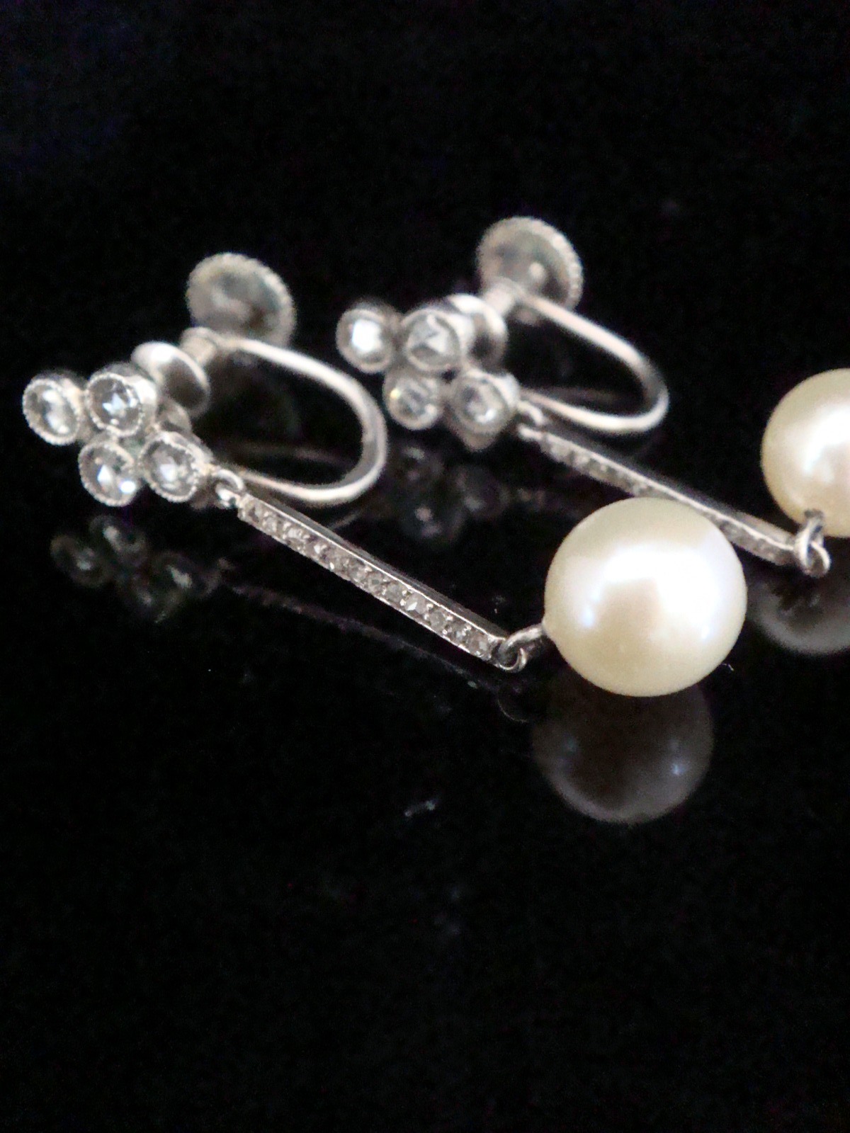 Edwardian Silver Set Rose Cut Diamond Natural Cultured Pearl Earrings