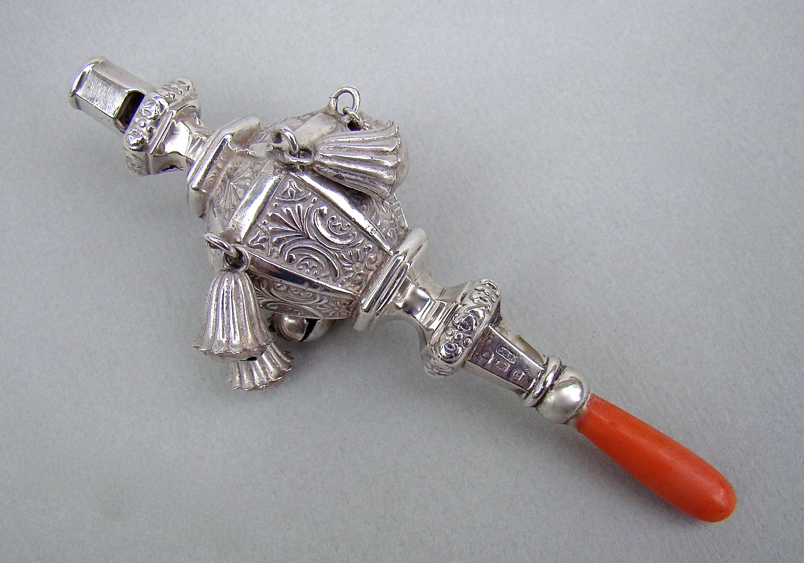 Edwardian Silver Six Bells Coral Rattle by Crisford & Norris, Birmingham 1902