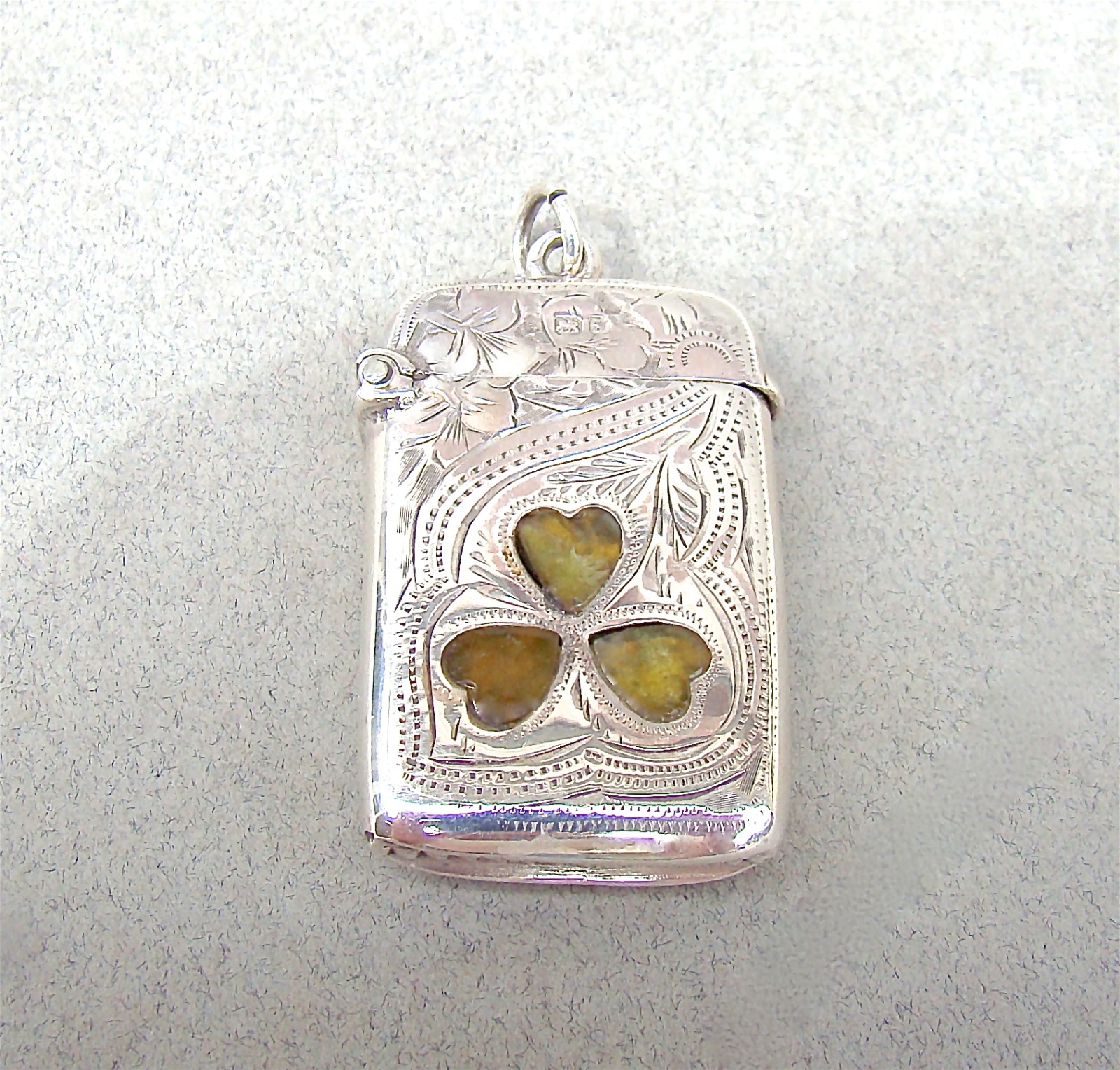 Edwardian Silver Vesta Inlaid with Connemara Marble Shamrocks by Smith & Bartlam, Chester 1907