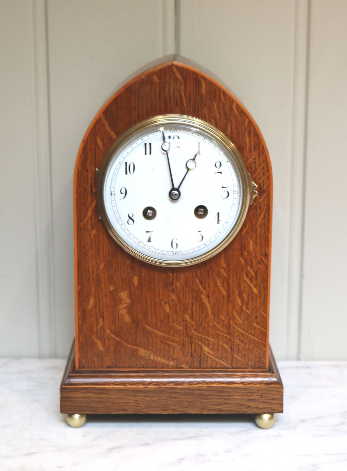 Edwardian Solid Oak Lancet Top Mantel Clock, England & France c.1910