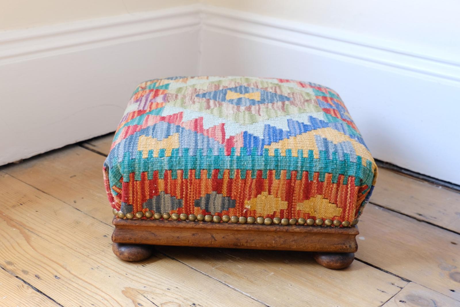 Edwardian Square Oak Kelim Covered Foot Stool
