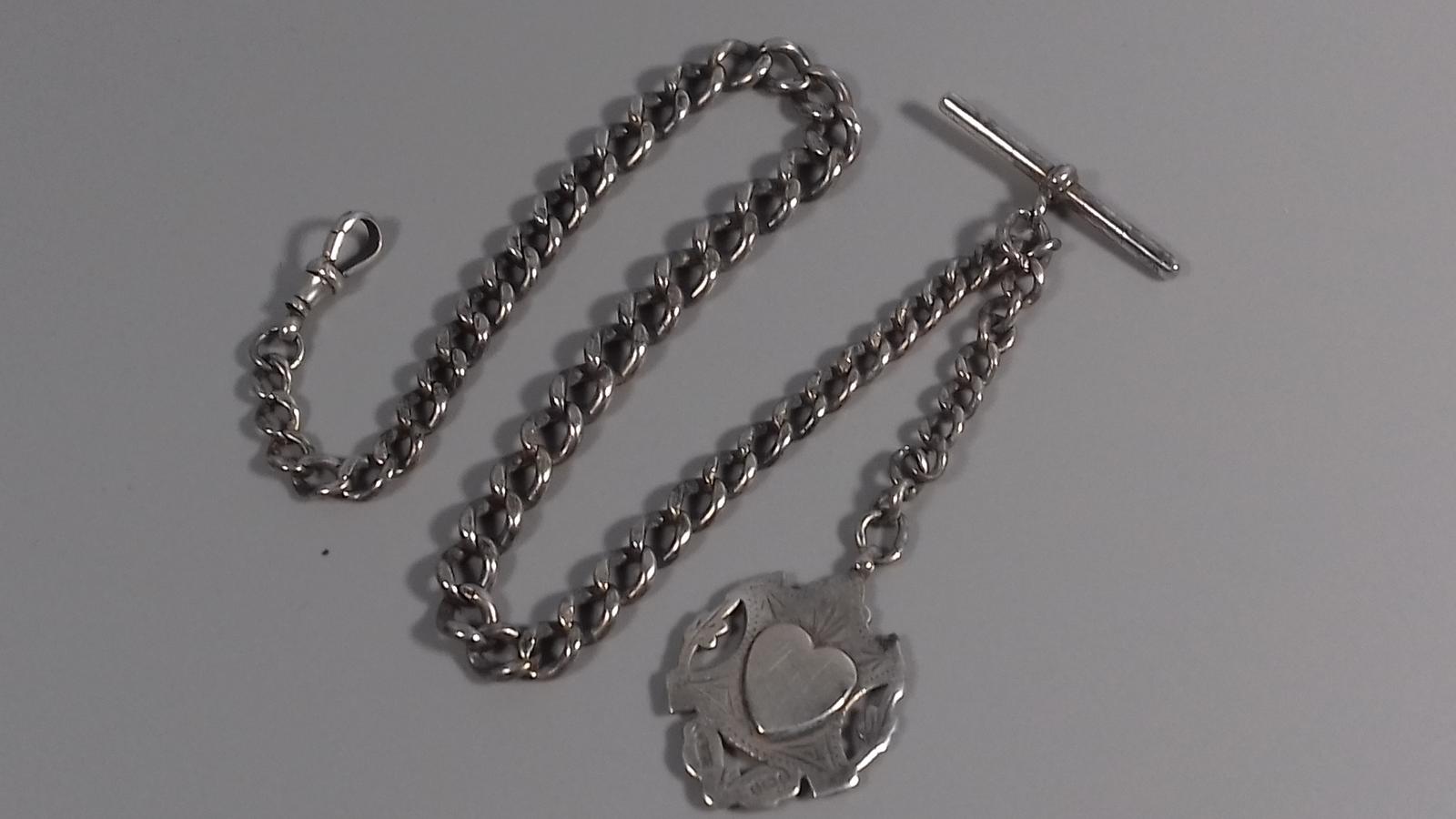 Edwardian sterling silver graduated albert fob pocket watch chain + heart medal 1902