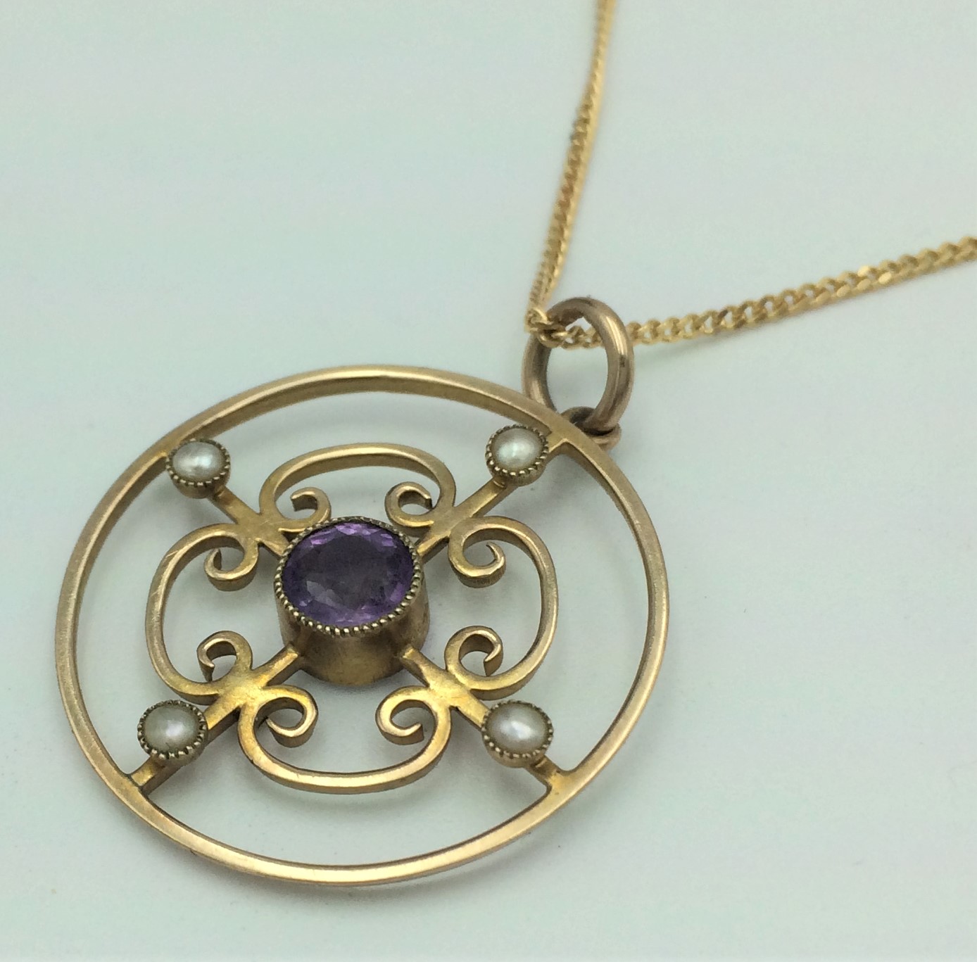 Edwardian - Victorian 9ct Gold Amethyst & Seed Pearl Pendant & Chain