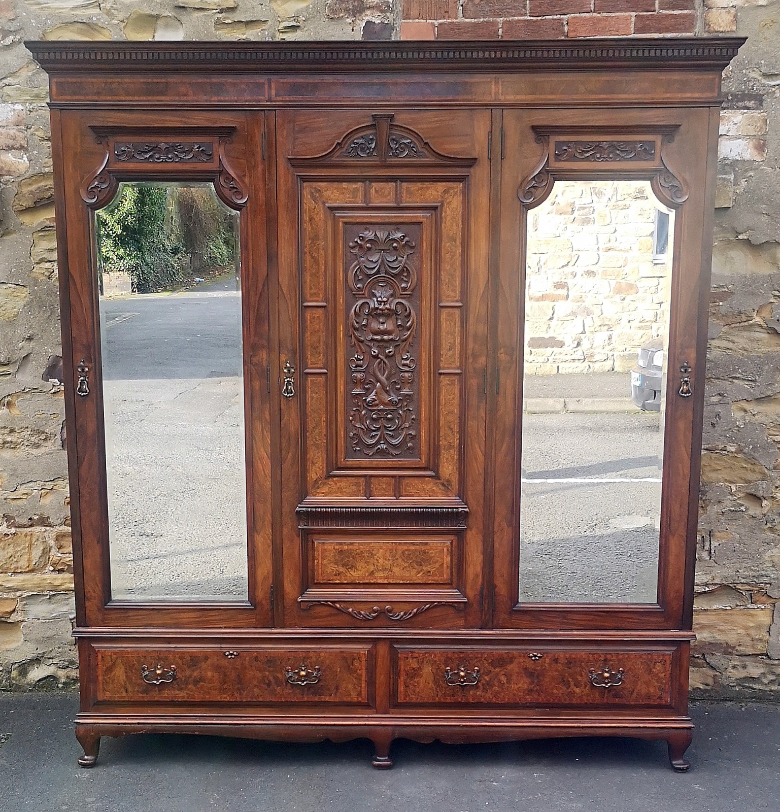 Edwardian Walnut Triple Door Wardrobe with Carved Decoration