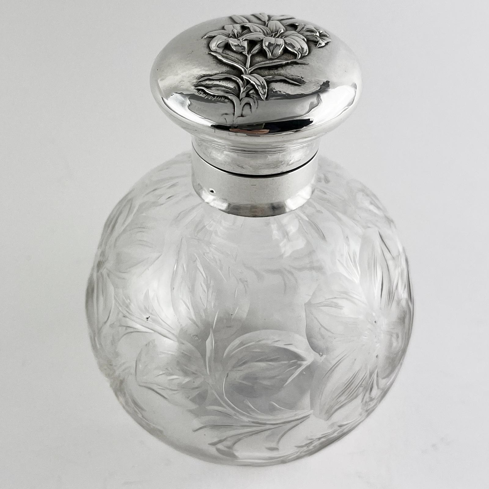 A most beautiful Edwardian William Comyns sterling silver topped perfume bottle. In a globe shape with hinged lid with a floral scene and original fitted stopper. The cut crystal bottle has been beautifully engraved with floral decoration. Very good original condition.