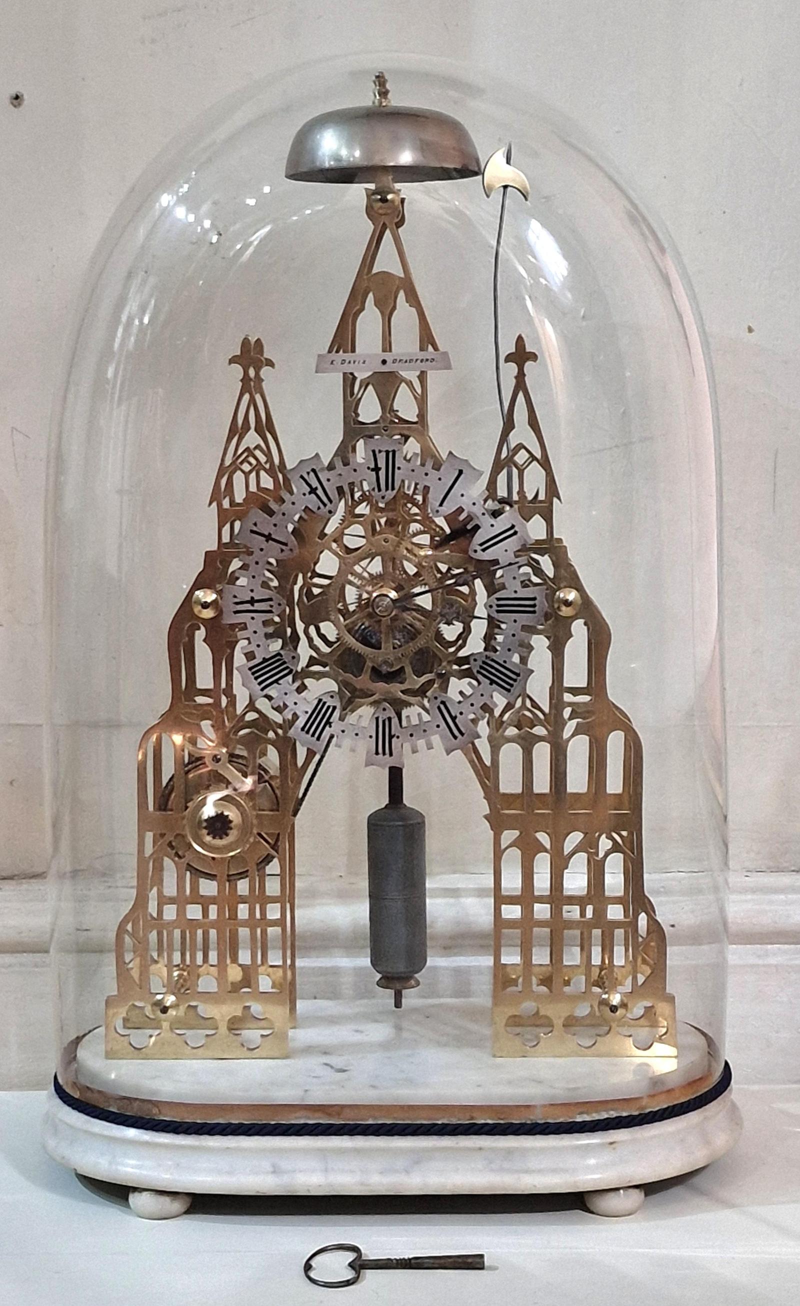 A spectacular and high quality English Victorian skeleton clock. Larger case proportions of 'cathedral' design. An original glass dome to the stepped white marble base standing on feet. A superb, silvered fretted dial with Roman numerals. Blued steel hands. A wooden pendulum rod with a cylindrical pendulum. A silvered plaque to the top by the maker, EDWIN DAVIS BRADFORD'. A higher quality, 6 spoke wheel, 8-day duration fusee mechanism with passing strike on a bell. Circa 1870.