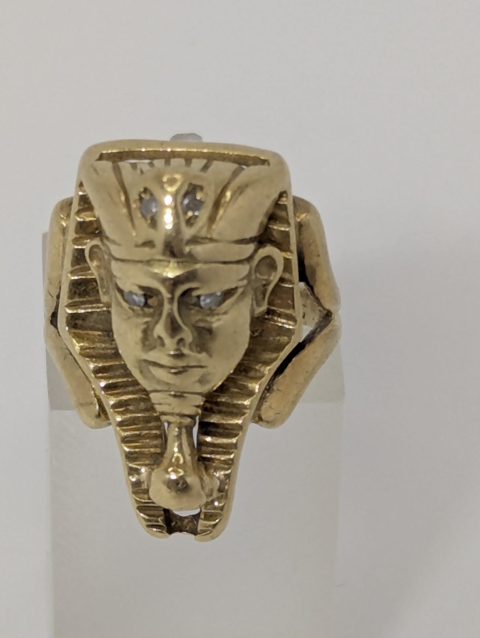This 18ct yellow gold ring features a masterfully detailed representation of an Egyptian Pharaoh, likely inspired by the iconic death mask of King Tutankhamun. The figure's eyes and headdress are inset with diamonds and as a piece of significant quality, it bears authentic Egyptian hallmarks. It has been tested for 18ct gold.