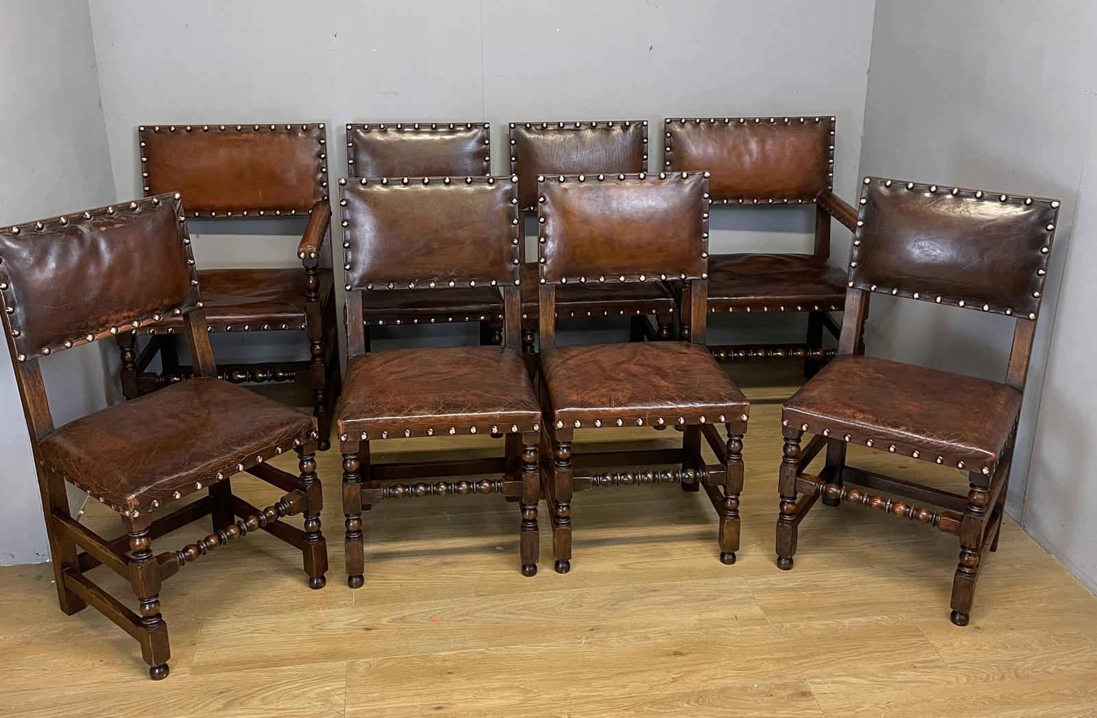 Eight Jacobean Style Leather & Oak Dining Chairs c.1890