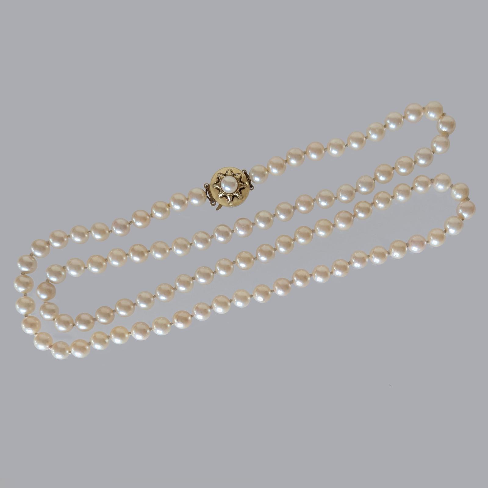 It fastens with a striking 14ct gold star-form clasp, centred with a pearl of approximately 6.9mm. The clasp is fitted with a secure concealed hook. The absence of a safety chain allows the clasp to be worn attractively at the front if desired.