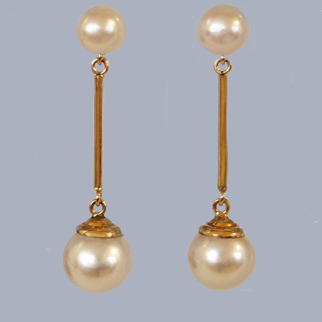 The upper pearl measures 5mm and supports a larger 7.5mm pearl suspended below, both displaying a rich creamy ivory tone and a deep, glowing lustre. Their refined proportions make them perfectly suited for both formal and occasion wear, offering timeless beauty with every movement.