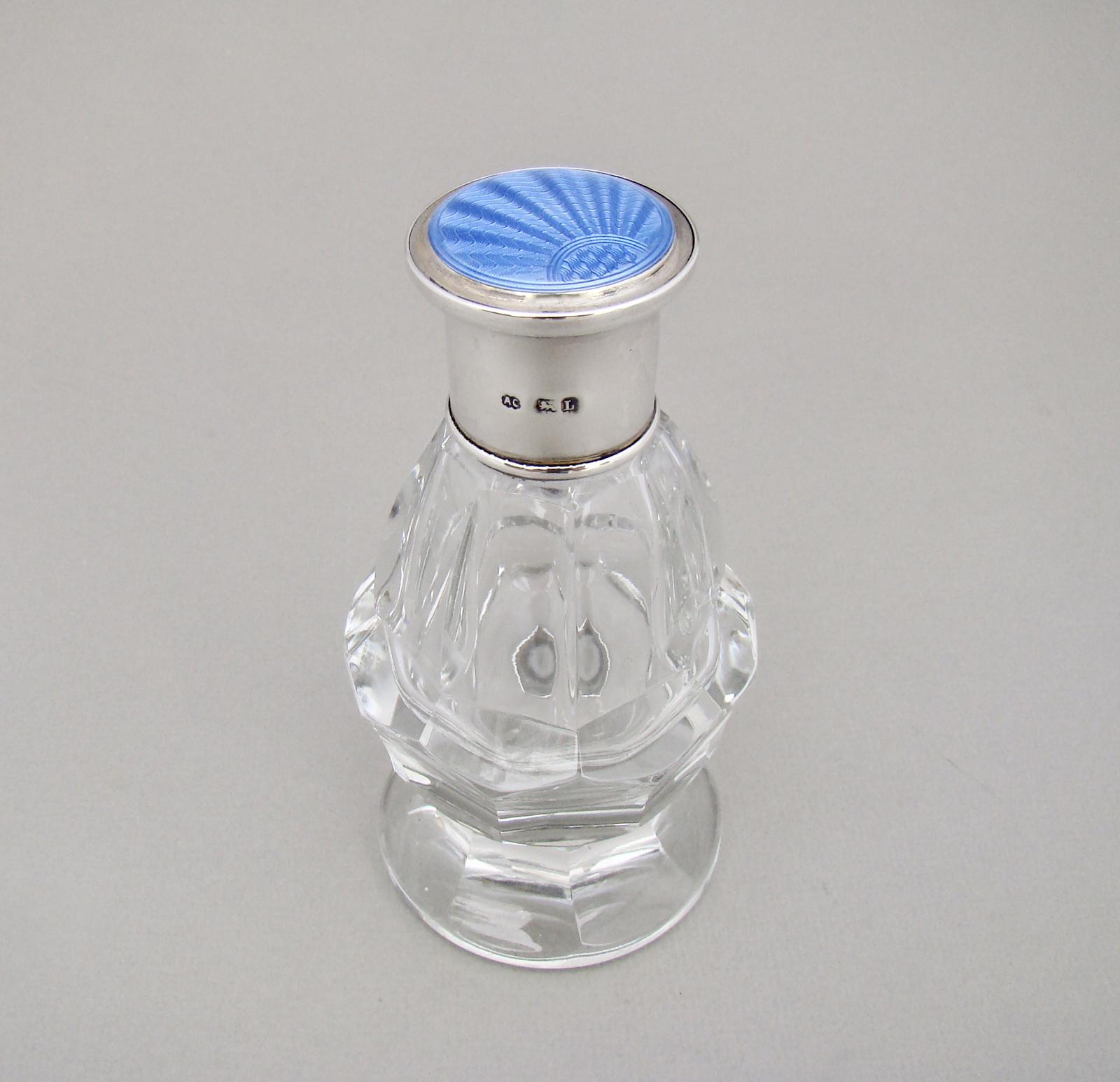 Elegant Art Deco Silver & Guilloche Enamel Cut Glass Scent Bottle by Albert Carter, Birmingham 1936