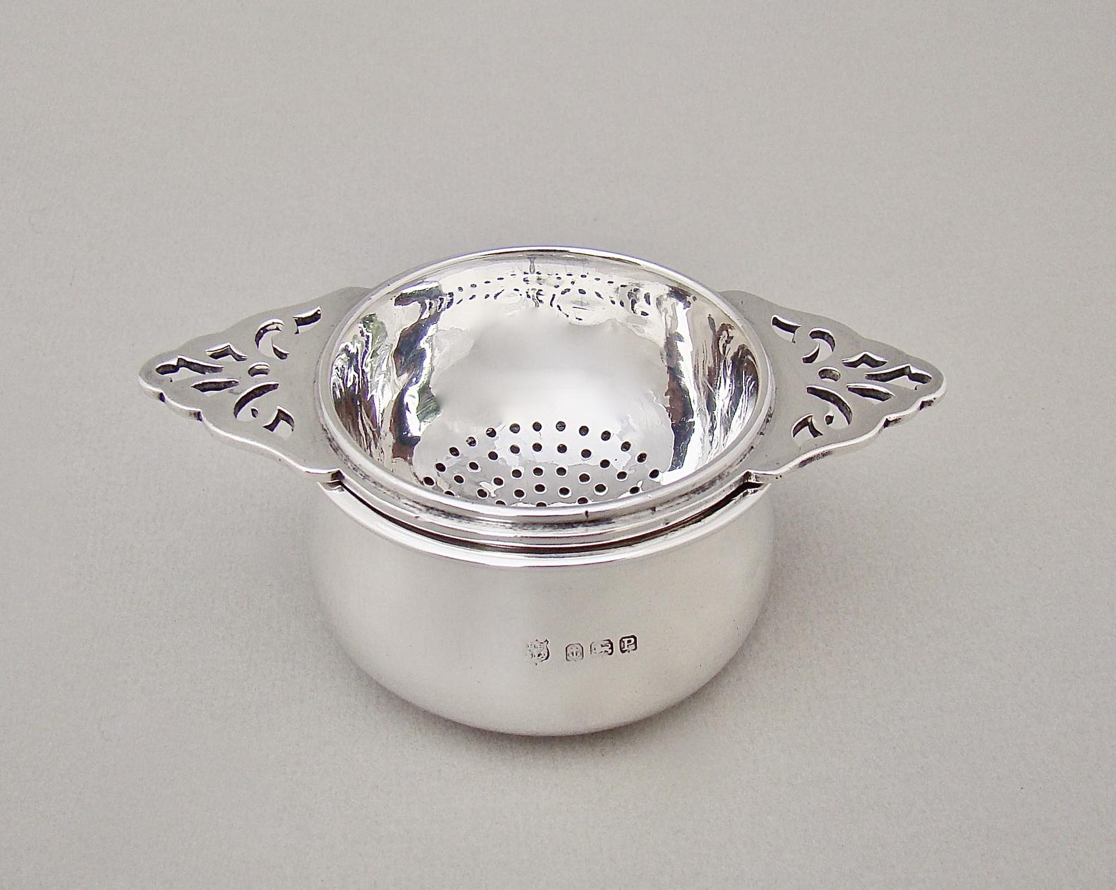 Elegant Art Deco Silver Tea Strainer & Stand By The Barker Brothers, Birmingham 1939