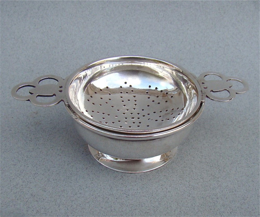 Elegant Art Deco Silver Tea Strainer & Stand by Thomas Ducrow & Sons, Birmingham 1939