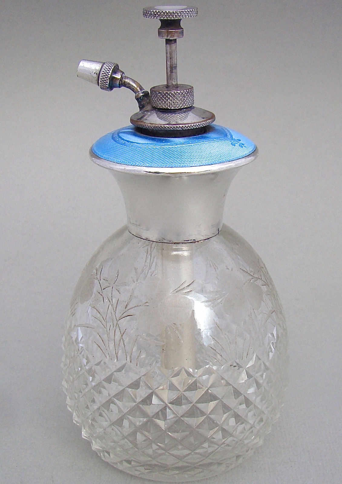 Elegant Art Deco Sterling Silver, Guilloche Enamel and Crystal Glass Atomiser, circa 1930