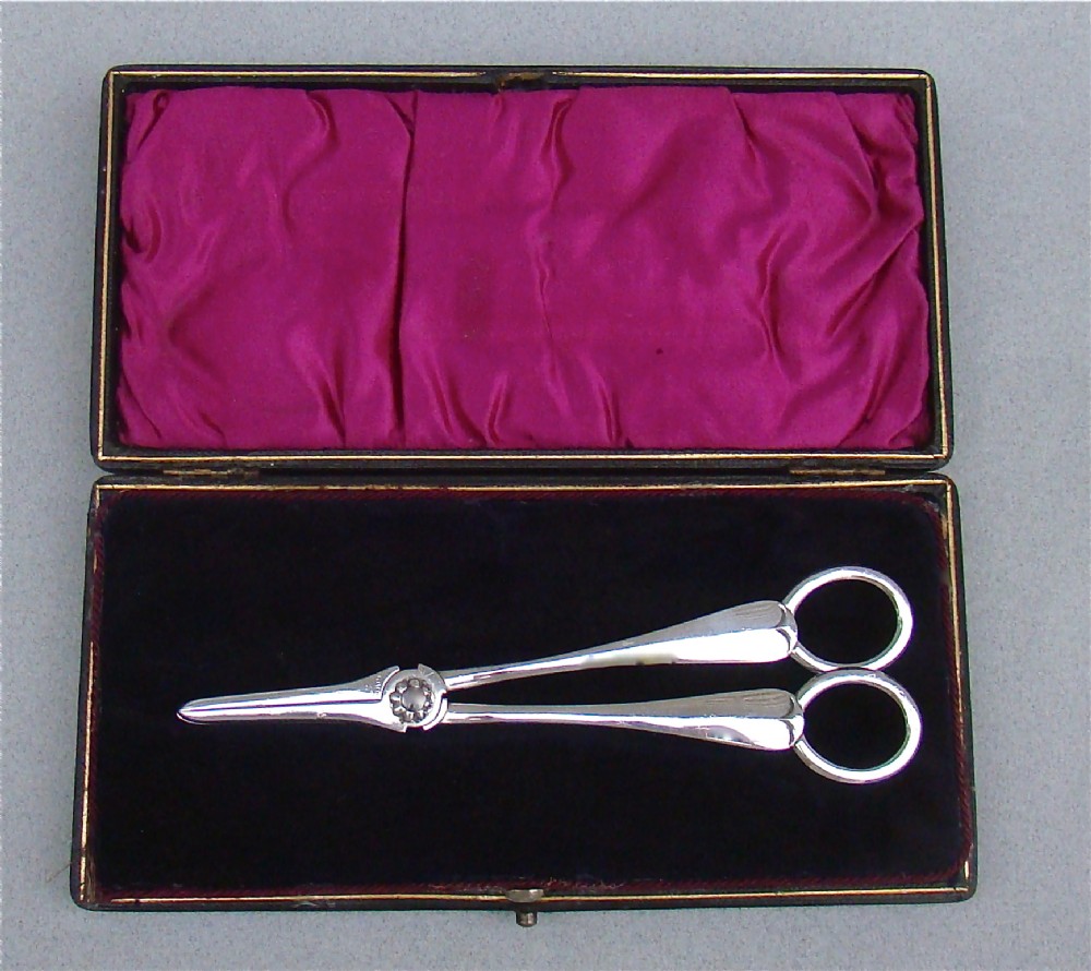 Elegant Cased Pair of Victorian Silver Grape Scissors by Francis Higgins, London 1888