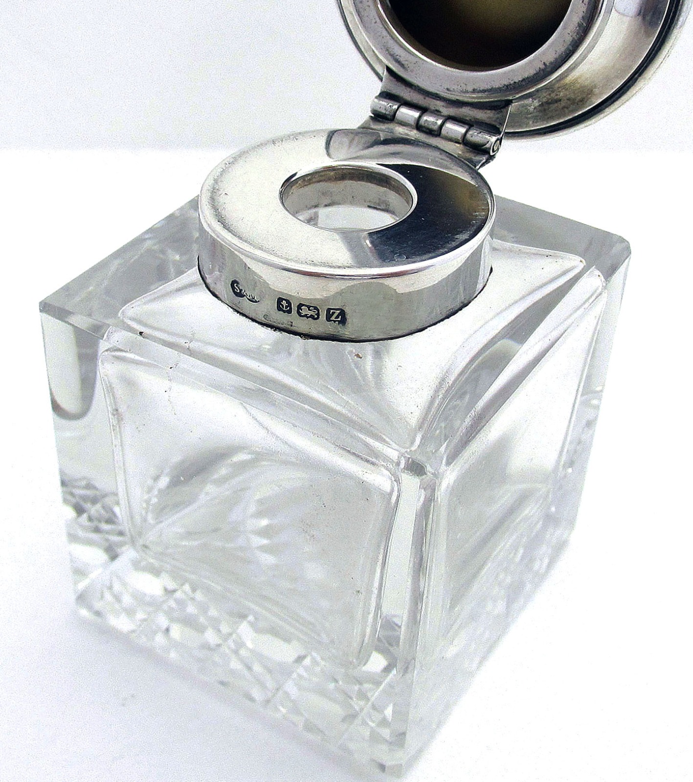 Elegant Cube Shape Plain Sterling Silver Inkwell Ink Pot / Box. English Birmingham Hallmarked. Vintage 1924