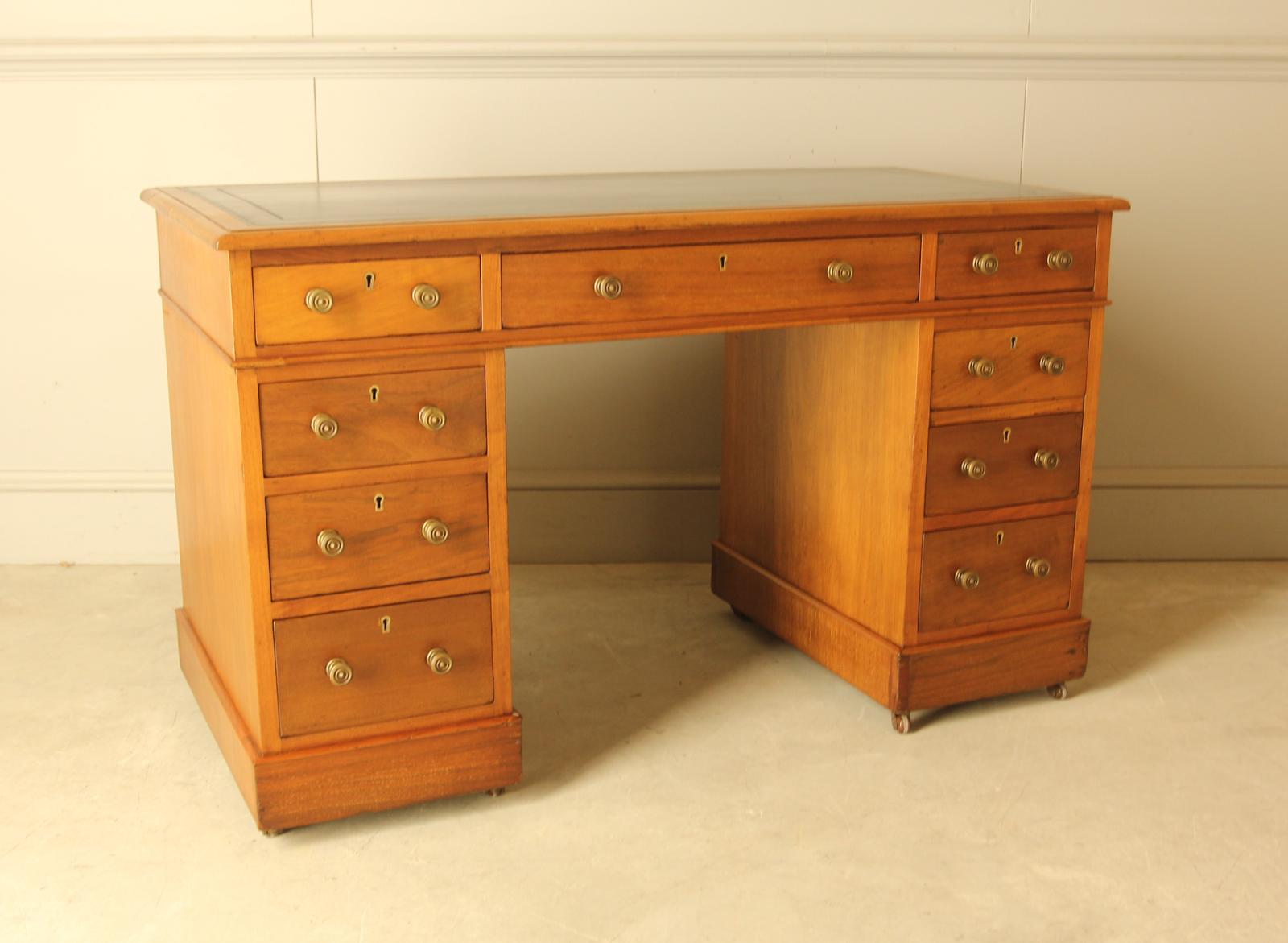 An elegant Edwardian walnut twin‑pedestal writing desk, finished with a black blind‑tooled leather top. Each pedestal offers four graduated drawers, complemented by a central long drawer and original brass pull handles. The desk is set on castors for easy movement.