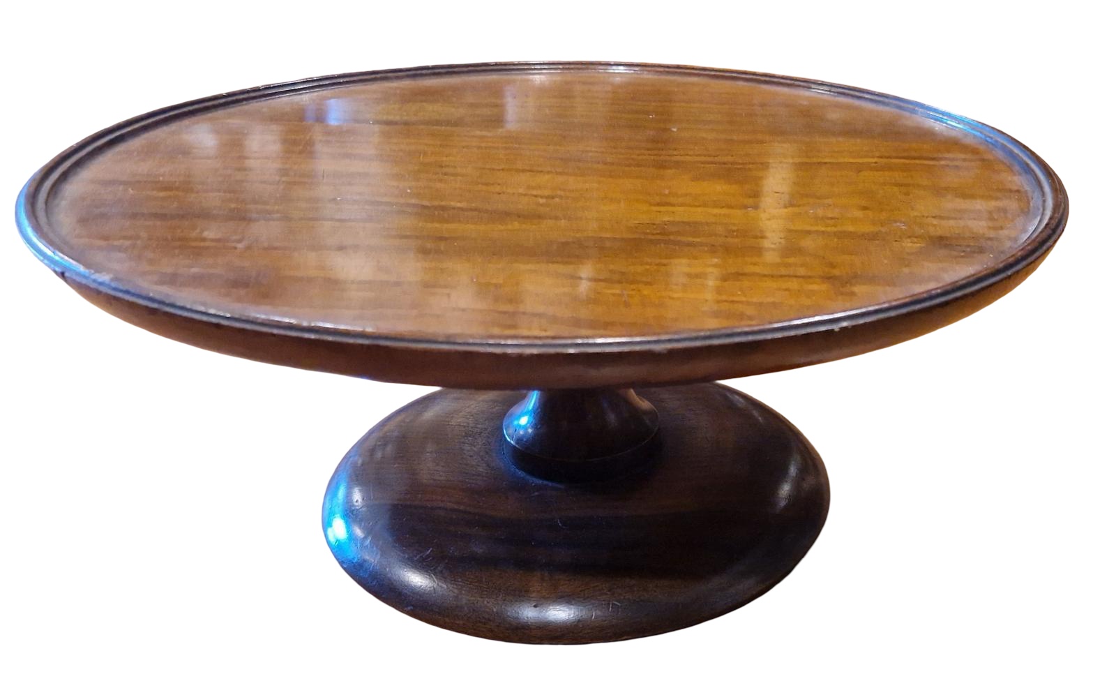 This is an elegant piece, designed to elevate your dining or buffet table, to impress your guests while serving their meal. The Lazy Susan has been made in mahogany with a wide circular top on a pedestal base. The base is beautifully turned and has a green fabric on the underside to protect the table. The top rotates smoothly. Their is little wear to the piece and would make a an elegant edition to your dining table.