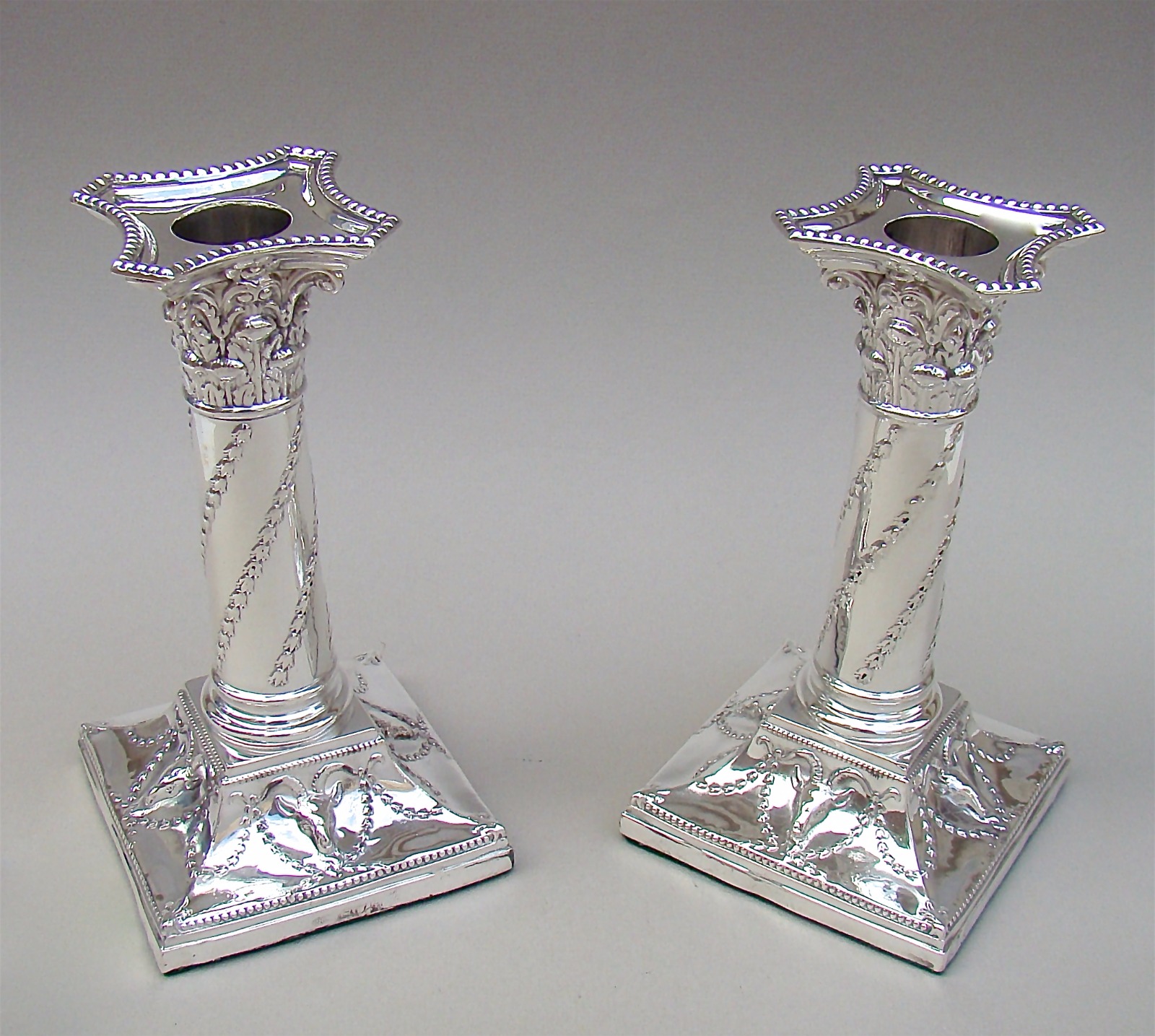 Elegant Pair of Edwardian Silver Corinthian Column Candlesticks by William Hutton & Sons, London 1904