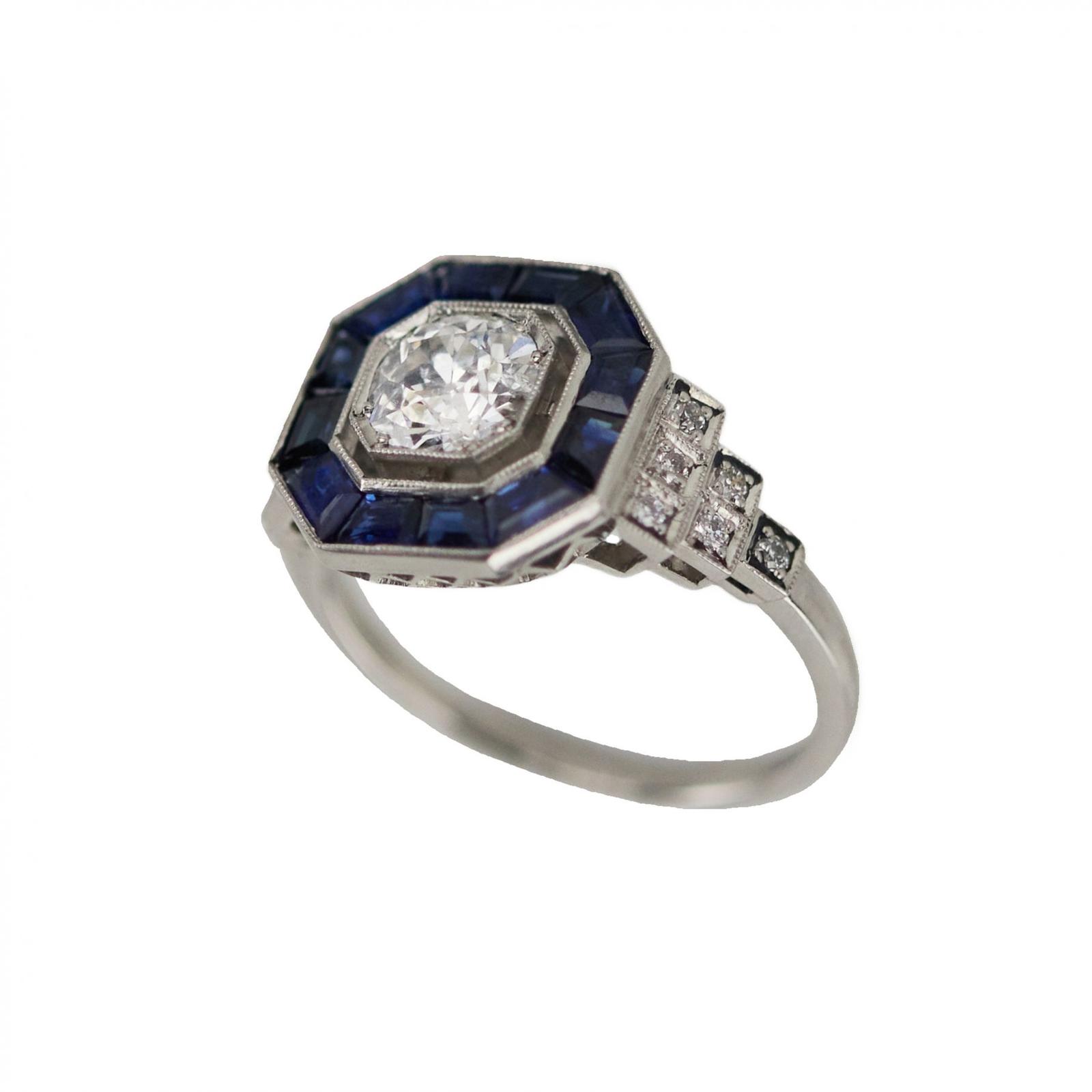 Elegant platinum ring with diamonds and sapphires.