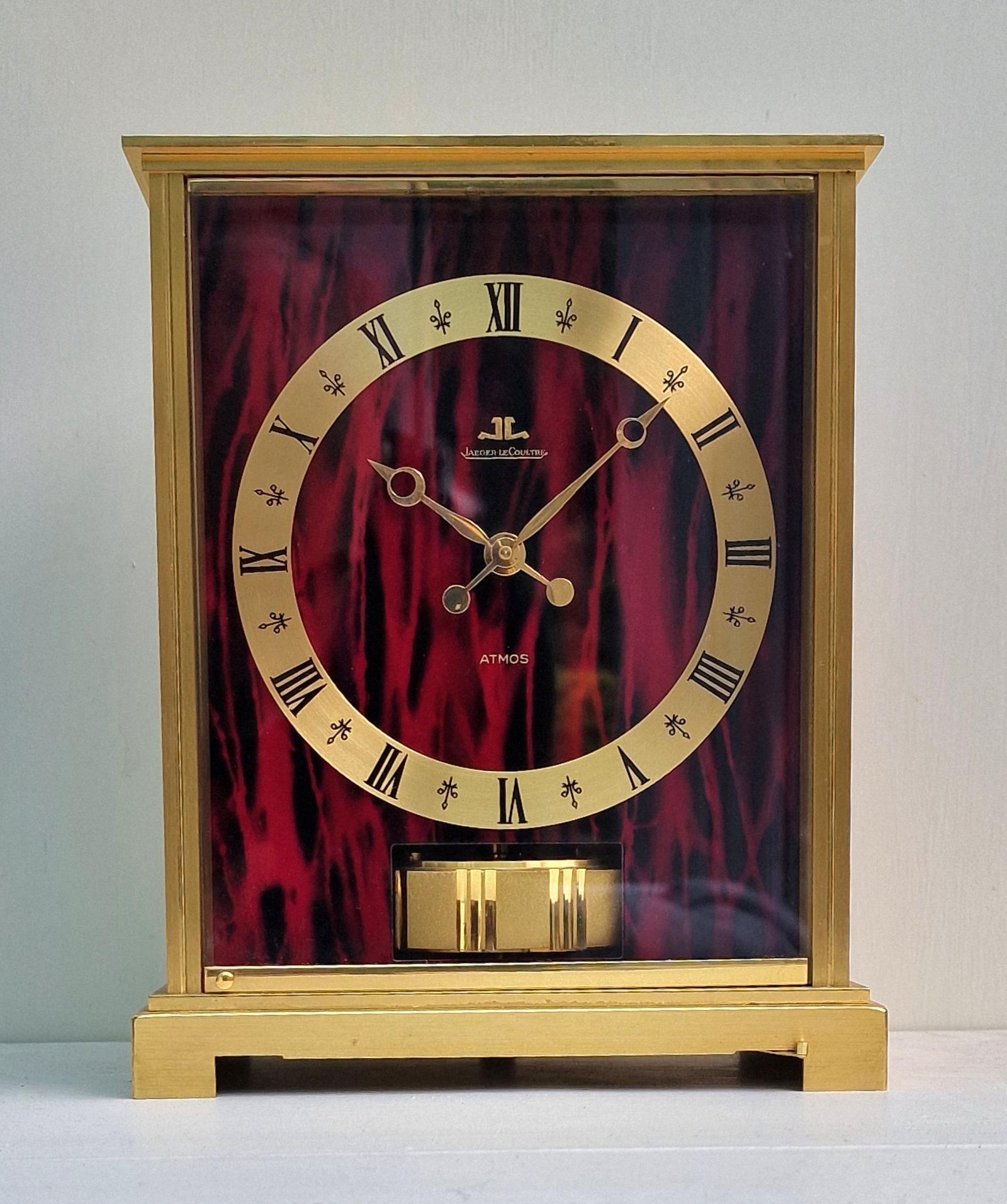 A Jaeger LeCoultre Atmos clock. A rarer 'Embassy' model with a red textured 'marbleised' dial. A gilt chapter ring and hands. A gilded case with the original finish in excellent condition. An opening front door with a pendulum slide lock beneath. Complete with the outer blue lined box and the original Atmos box and instructions information.