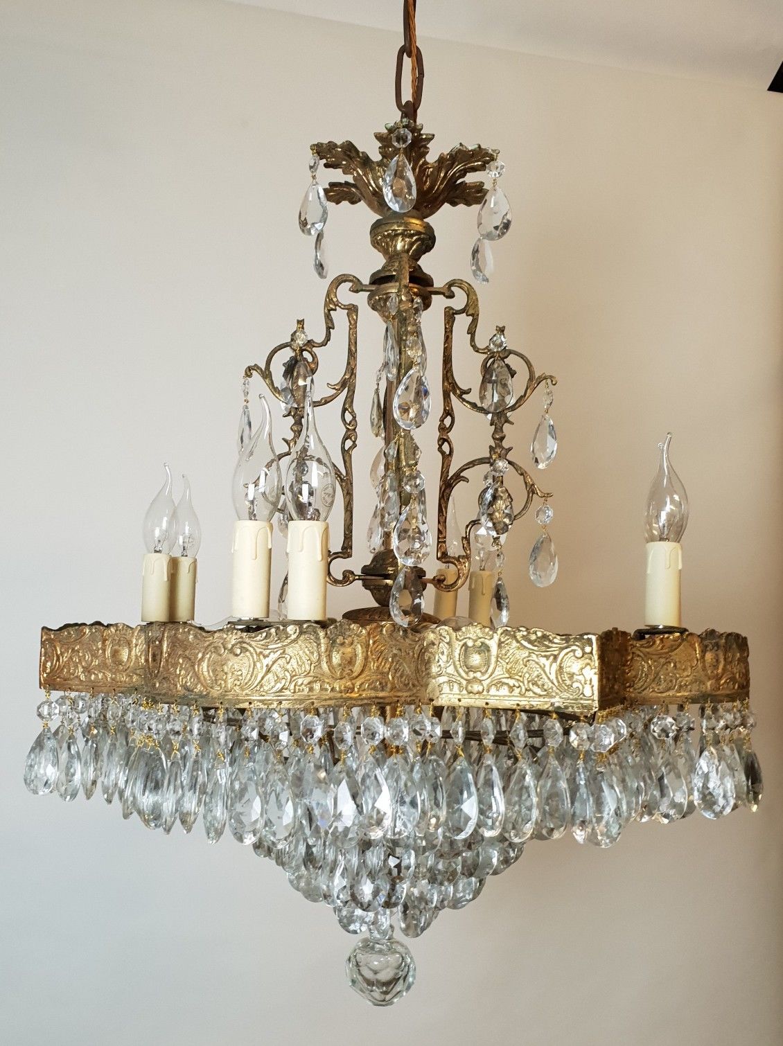 Empire Square Brass Waterfall Chandelier; Rewired C.1920 (No 2 of a Pair)