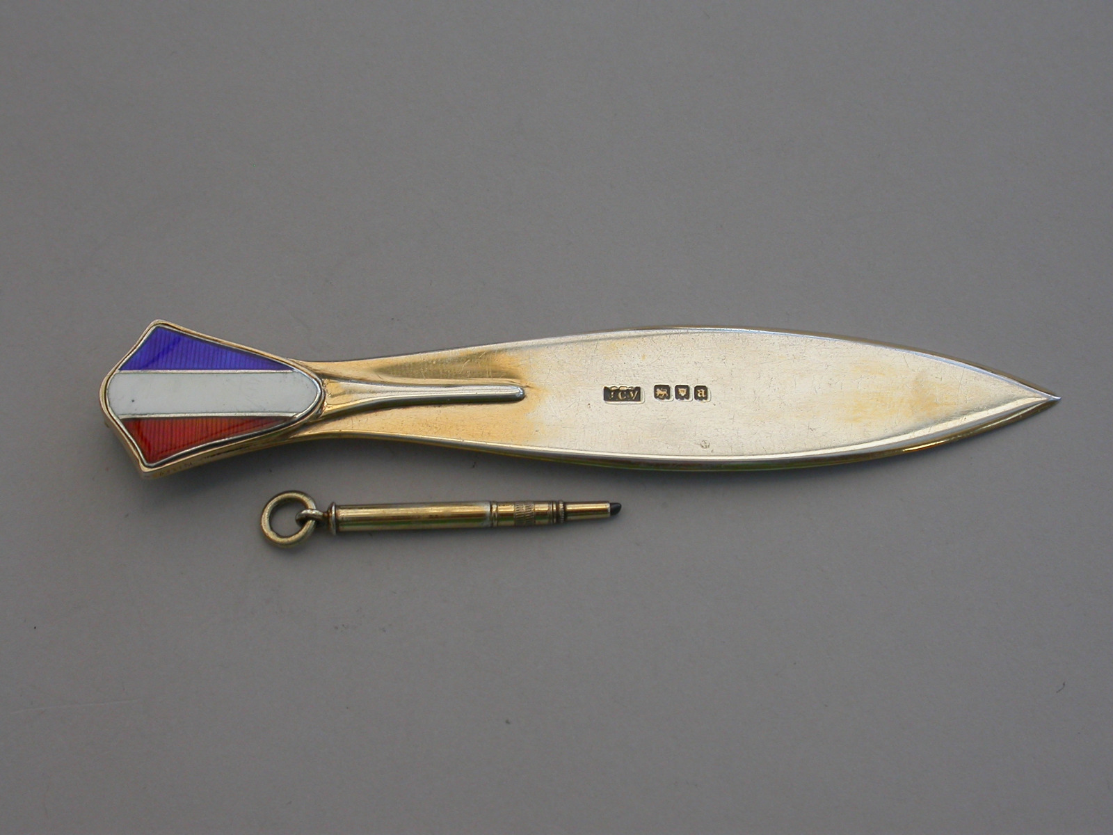 Enamelled French Tricolour Flag Silver Gilt Bookmark / Pencil by J C Vickery, London, 1916