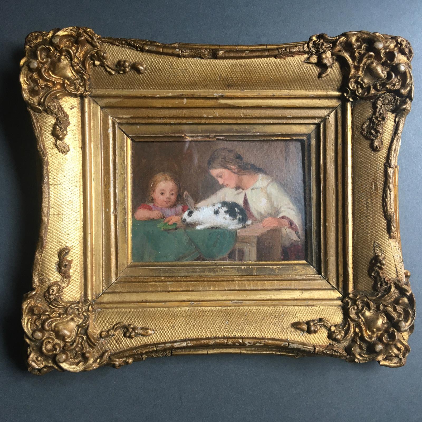Enchanting Victorian Painting of Two Girls & Rabbit