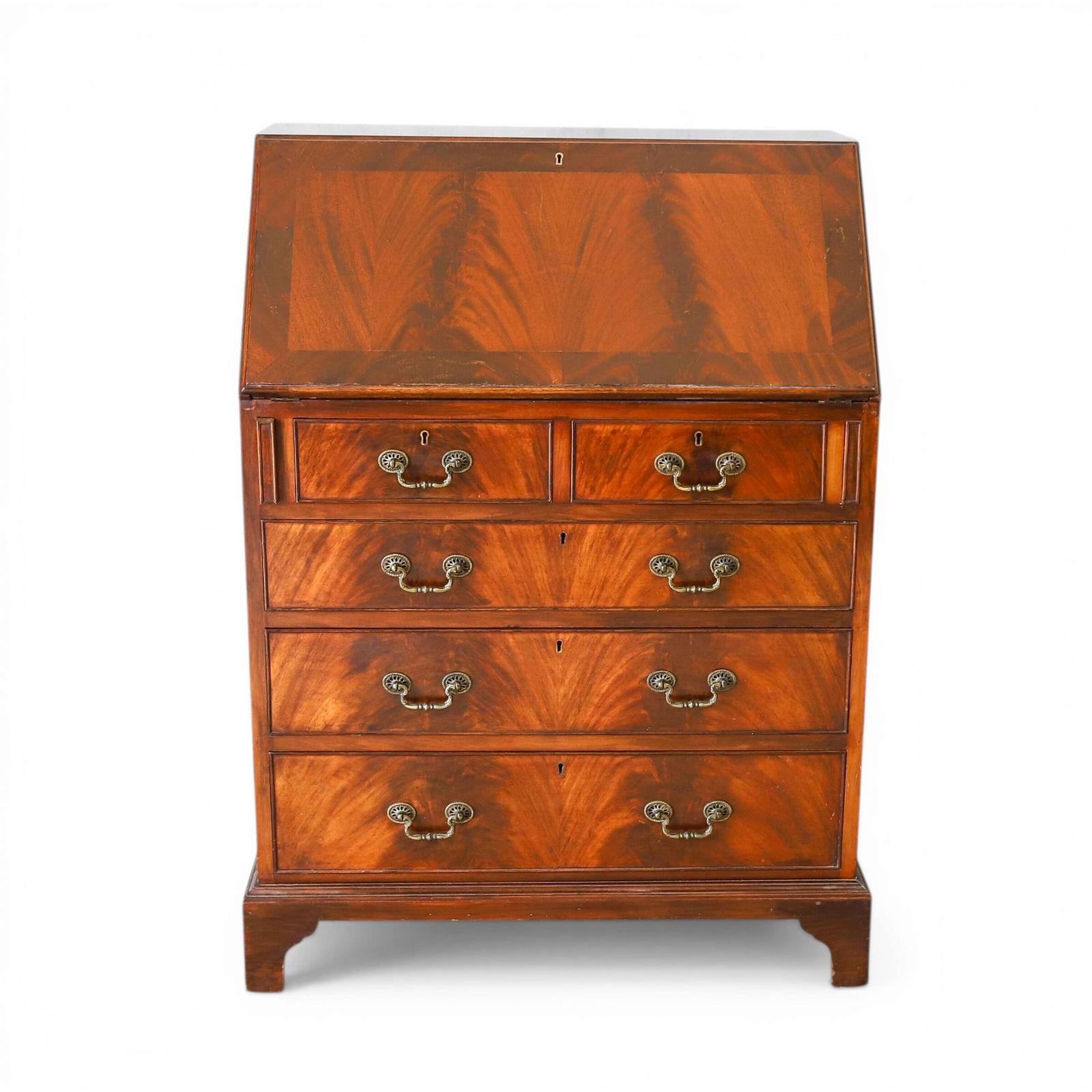 The flame fronted fall opens to reveal a functional writing surface supported by pull‑out desk supports. The mahogany shows attractive grain and a warm, settled tone throughout. Surface marks are consistent with age and use, contributing to its character. When closed, the left desk support protrudes slightly — a minor quirk noted for accuracy but not detracting from its overall presence. Solid, well balanced and pleasing in scale, the bureau remains a versatile and useful piece.