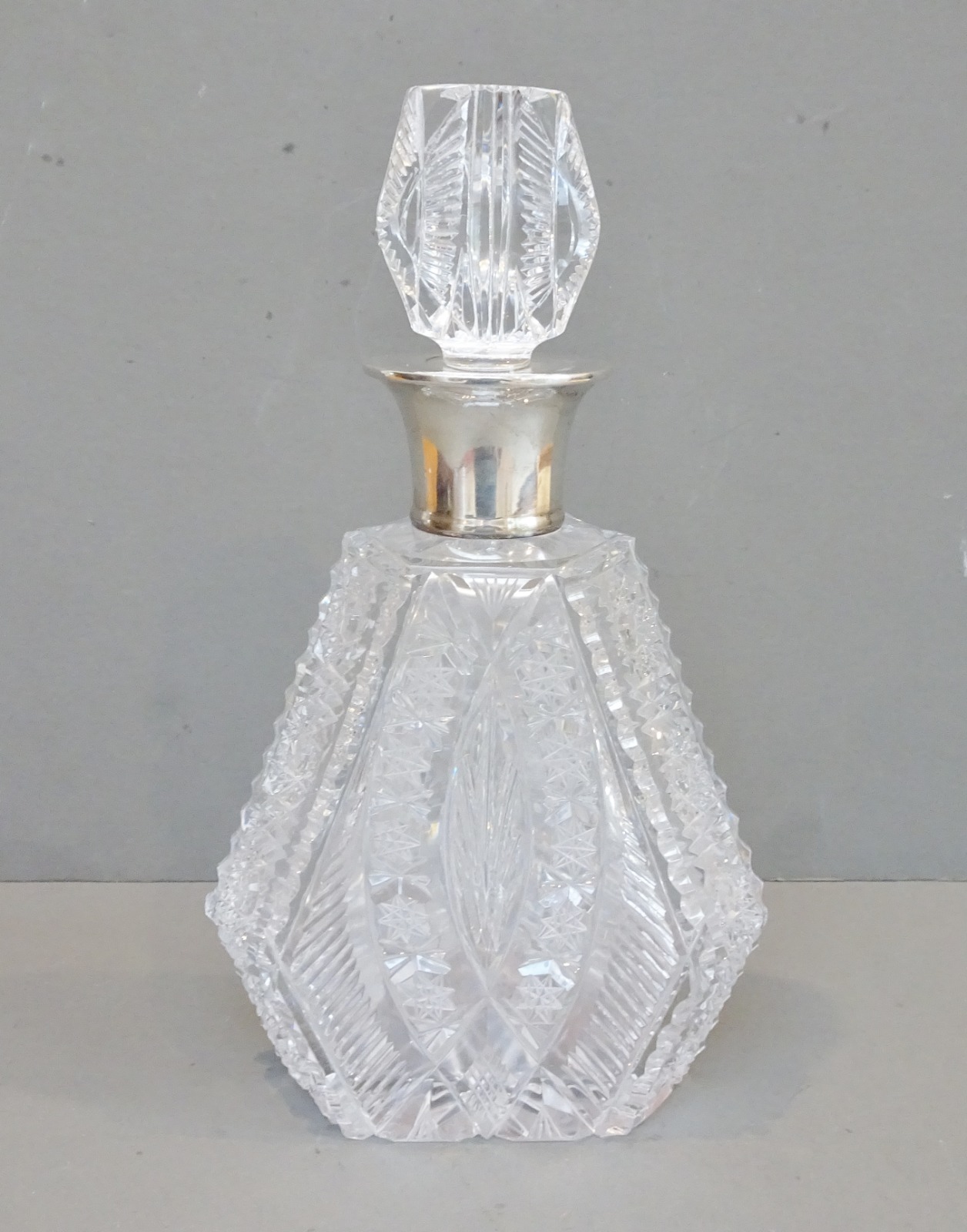 English Antique Cut Glass Decanter. Solid Silver Collar. Hallmarked Preece & Williscombe. London 1938