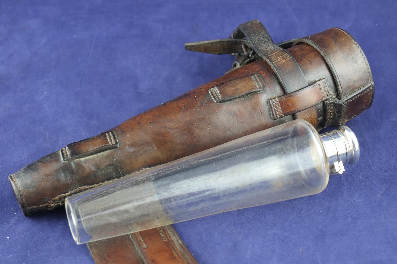 English Antique Hunting Flask in Leather Saddle Case by James Dixon