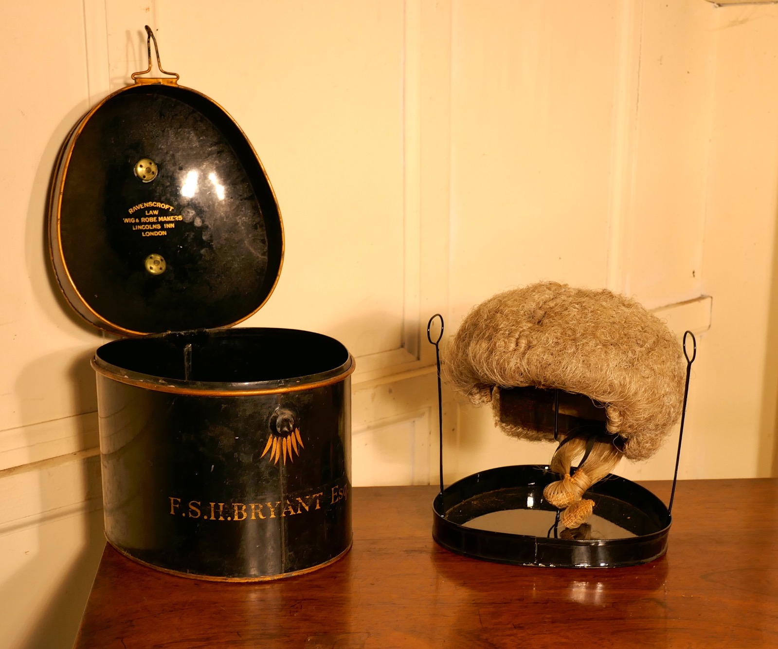 English Barrister's Bench Wig in Original Tole Box with Riser by Ravenscroft Law