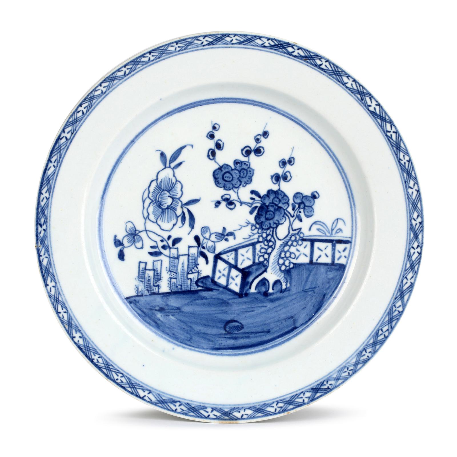 English Blue & White Ceramic Chinoiserie Fence Pattern Decorated Plate 18th Century