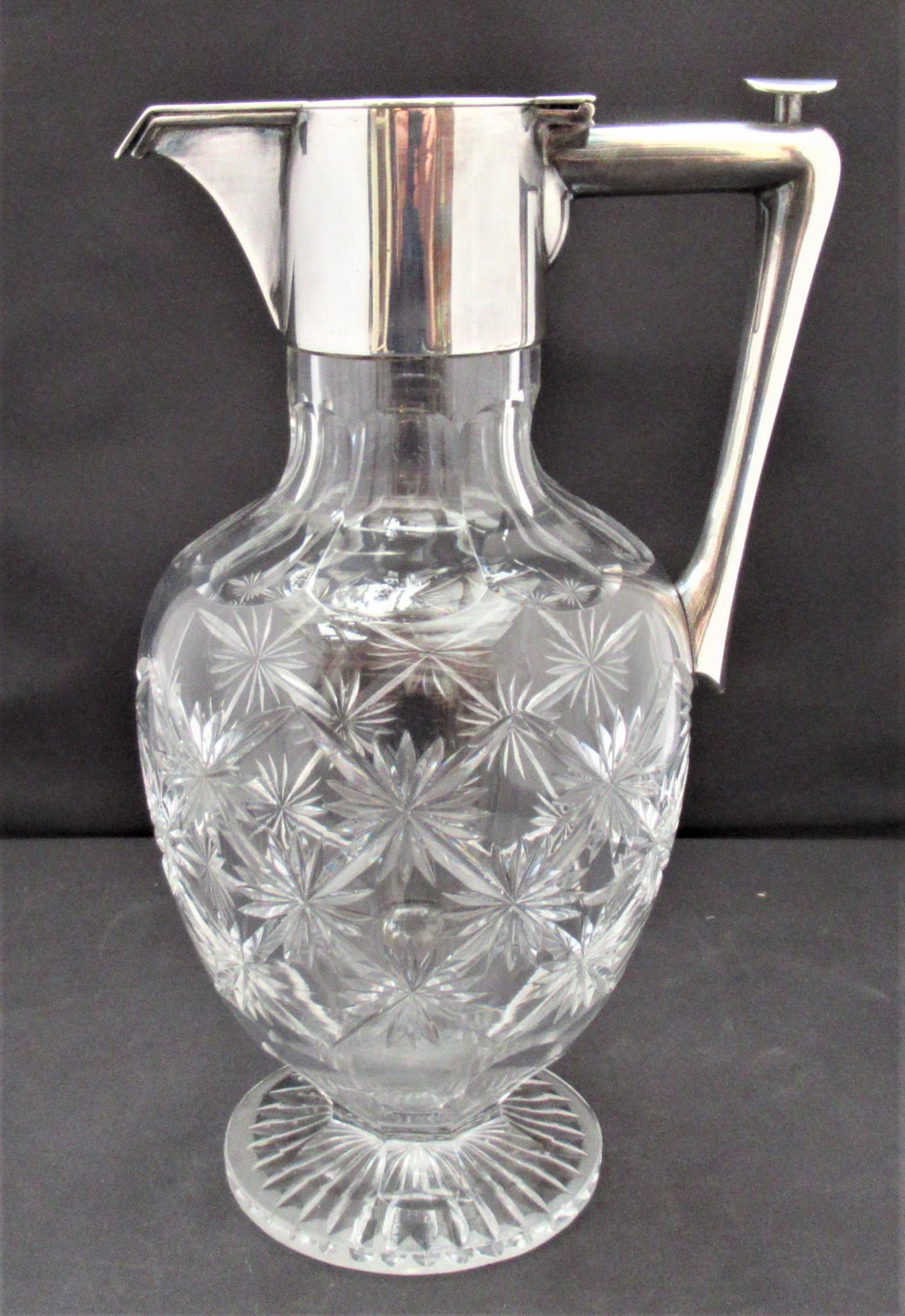 English Cut Glass Claret Jug, with Silver Plated Mount & Push Button Lid c.1910
