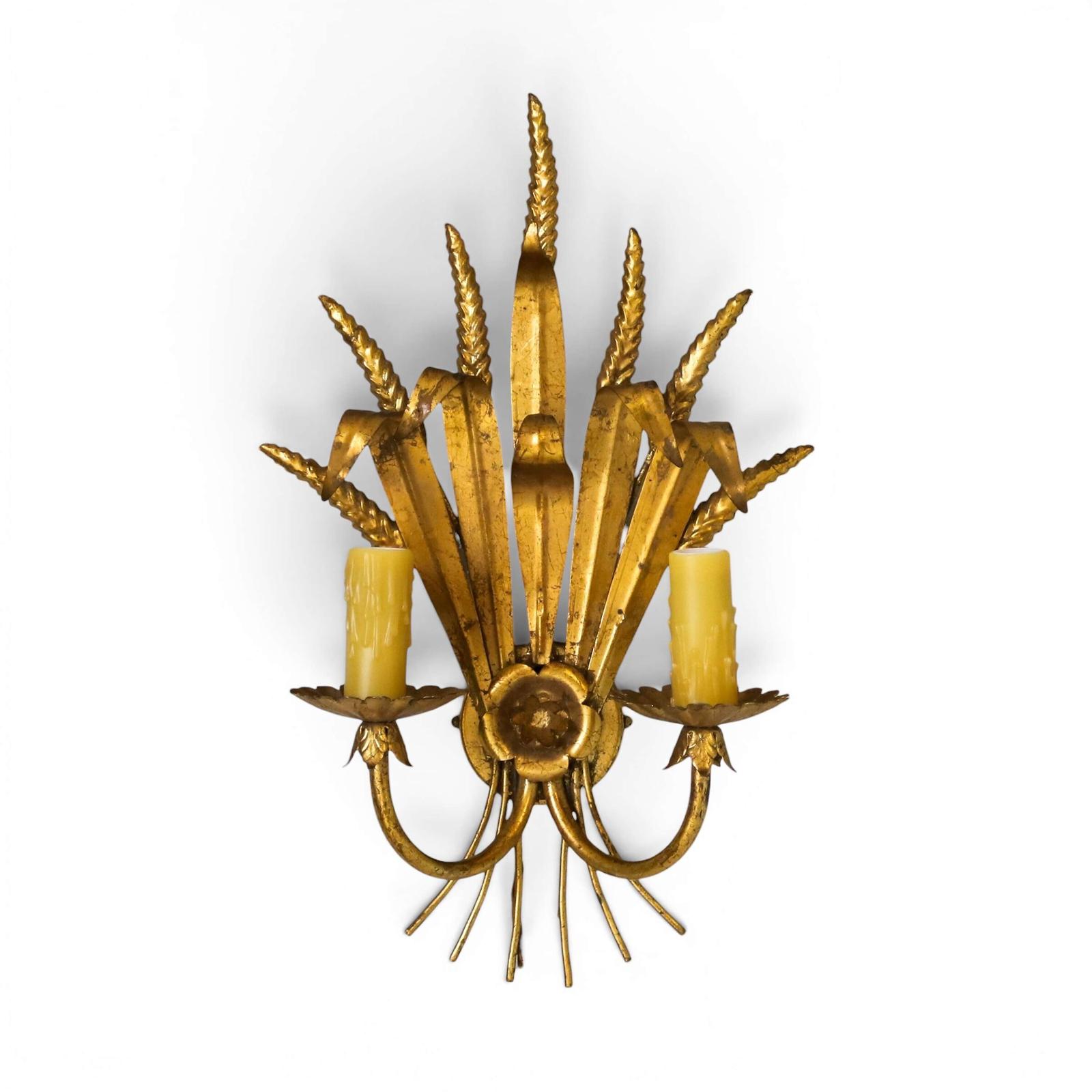 English Mid‑Century twin‑candled electric wall sconce in gilt metal. Recently rewired to British Standard, with a beautifully warm gilded surface and elegant, sculptural form. A striking decorative lighting piece that brings character and soft illumination to any interior.