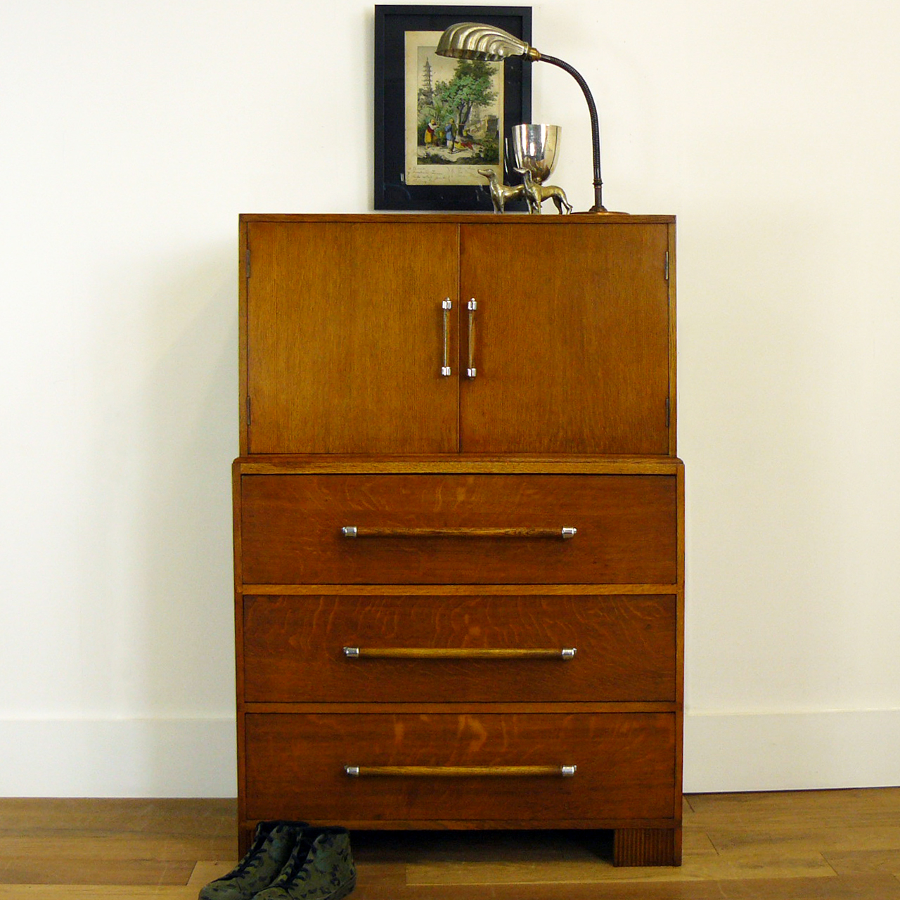 English Oak 1930s Art Deco 2 Drawer Tallboy Chest Wardrobe (1 of 1)